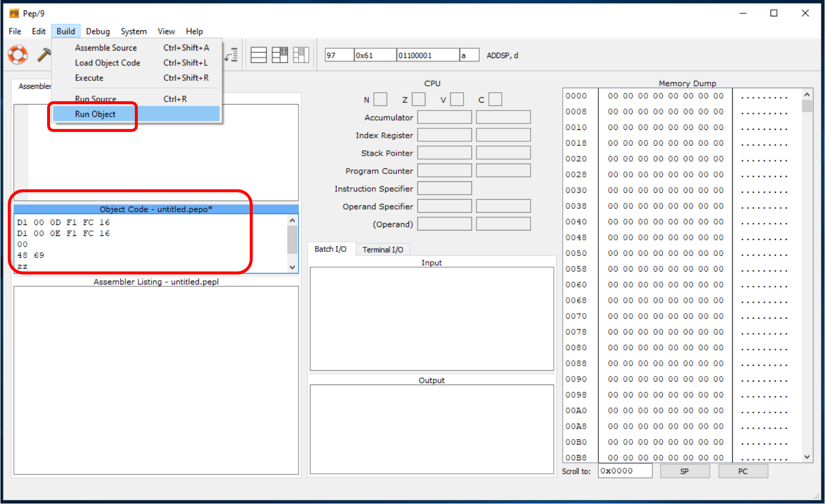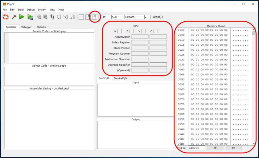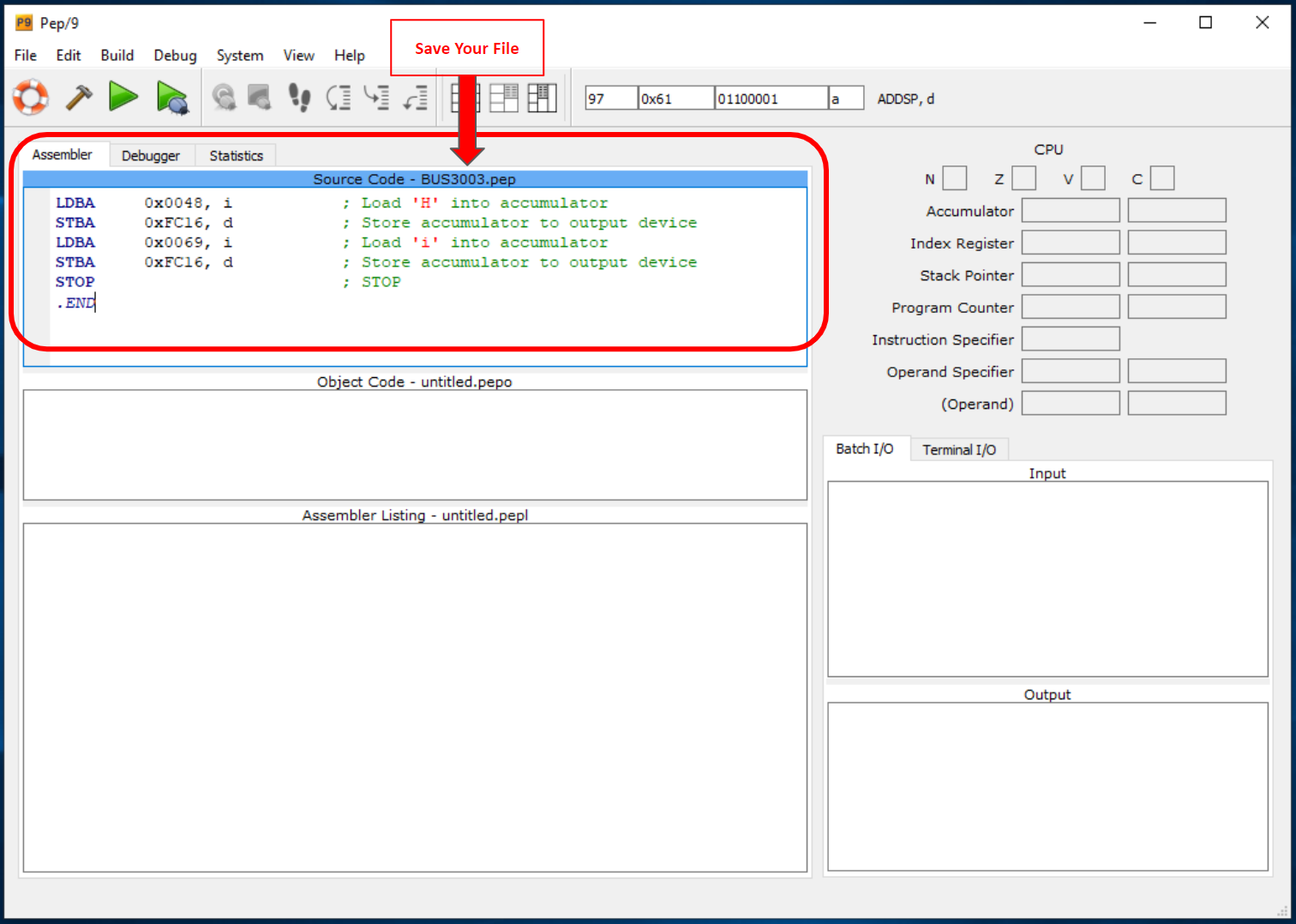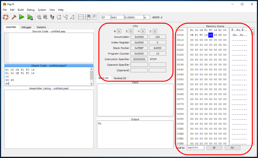 Download the Pep/9 Simulator and Assembler, launch the simulator and test it with the Source Code as shown in the screenshots below (page 165 of your textbook). This program (Source Code) prints the word “Hi”. You can access video tutorials here.