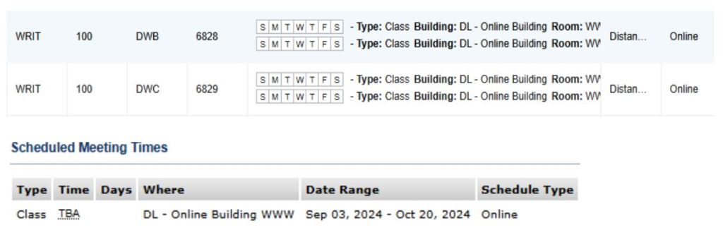 The course is delivered online. There is no class day or time because there are no scheduled classes. Some courses may require students to complete tests in person. Students need to set aside time each week for self-study via Blackboard to work through course materials and assignments. When registering, the class search option will show no meeting times (or “TBA”) and the location as “Online WWW.” Refer to the example in the screenshot below.