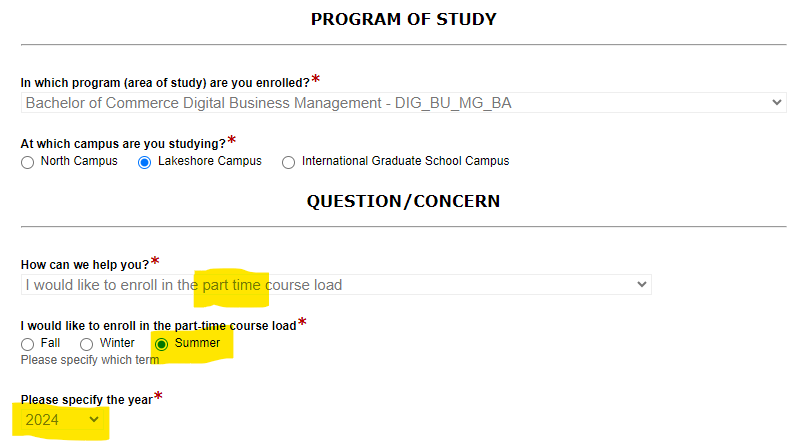 - Complete the E-Form as shown in the screenshot below, indicating that you would like to be enrolled “part-time”