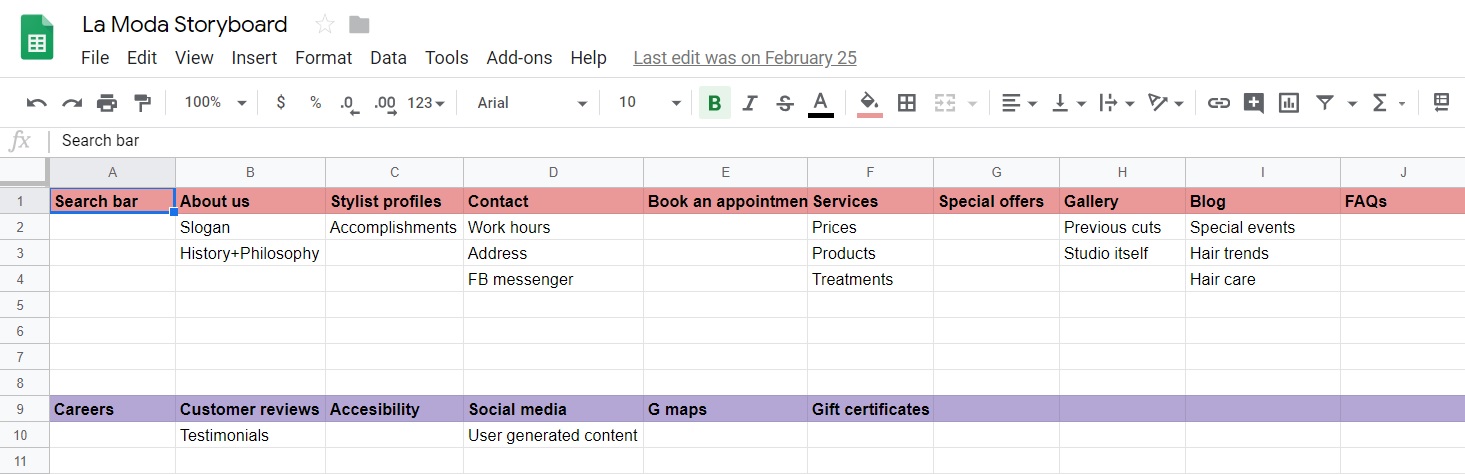 - Feb 5: The class reviewed La Moda’s answers, the above progress, and worked on a storyboard (view image of final suggested structure), a number of themes were suggested (ref: Chapters 3&4, Design Thinking resources on BB, phases 2&3)